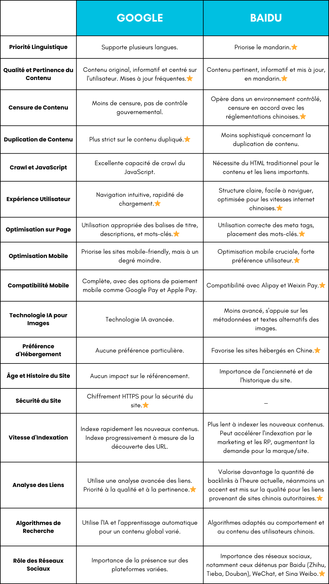 Pour comprendre les différences entre Google et Baidu en termes de référencement (SEO), voici un tableau récapitulatif des points clés :