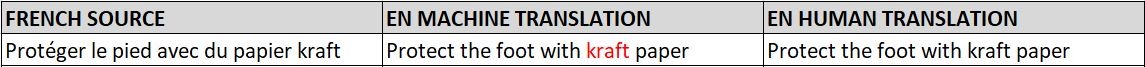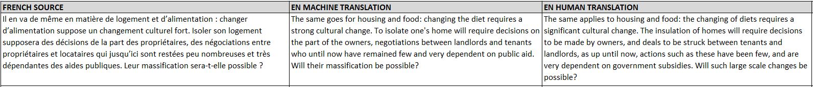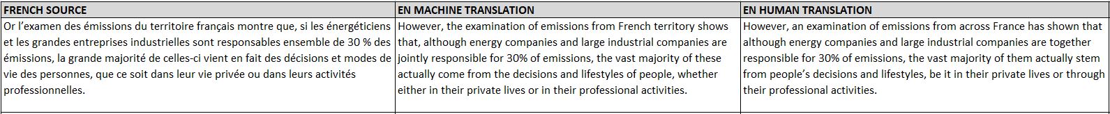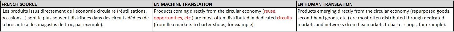 - Nous avons observé que la traduction automatique choisissait le plus souvent un vocabulaire approprié. Cependant, il y avait parfois des problèmes de cohérence. Curieusement, certains termes français n’étaient pas toujours traduits en anglais de la même façon, même lorsque la phrase source était identique, comme le montrent les exemples ci-dessous :