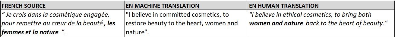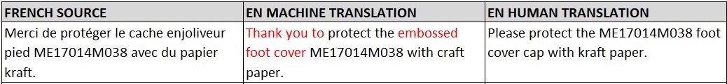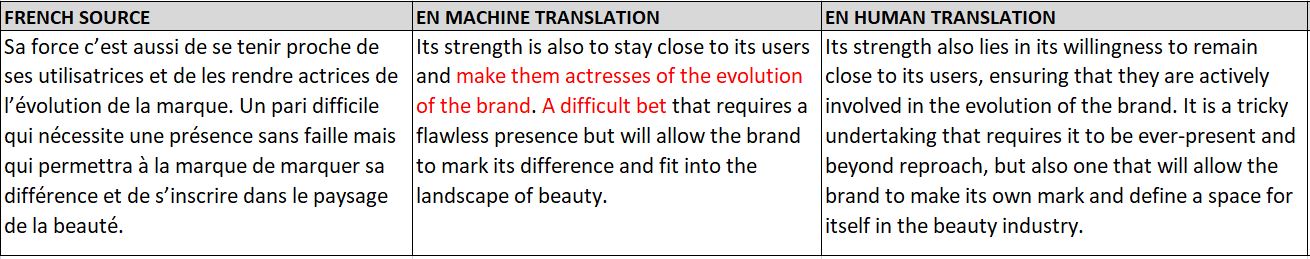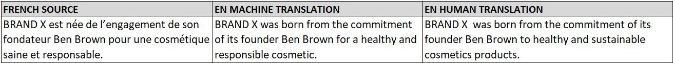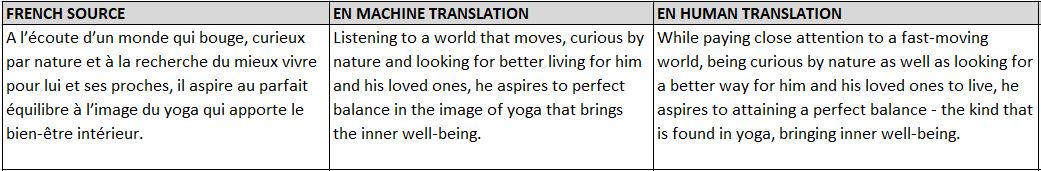 - Pour transmettre pleinement le message de l’auteur dans une autre langue, la traduction de documents comme celui-ci exige beaucoup de doigté et de délicatesse. La traduction automatique nous donne quelque chose que nous pouvons lire et comprendre, mais pas beaucoup plus. Pour passer à l’étape suivante et faire ressortir le texte original dans sa forme la plus complète, faire appel à un rédacteur ou à un expert en marketing est une étape essentielle, comme nous pouvons le voir dans l’exemple ci-dessous :