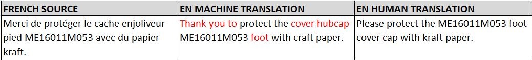Voici un autre exemple d’utilisation incohérente du vocabulaire (« embossé » n’apparaît pas cette fois-ci, même si le terme source « cache enjoliveur » est le même dans les deux phrases !). Notez également l’ordre plutôt confus des trois noms en rouge :