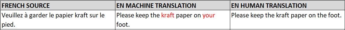- Voici un autre exemple de la traduction automatique qui ne tient pas vraiment compte du contexte du document. Le pied dans le document n’est pas un pied humain !