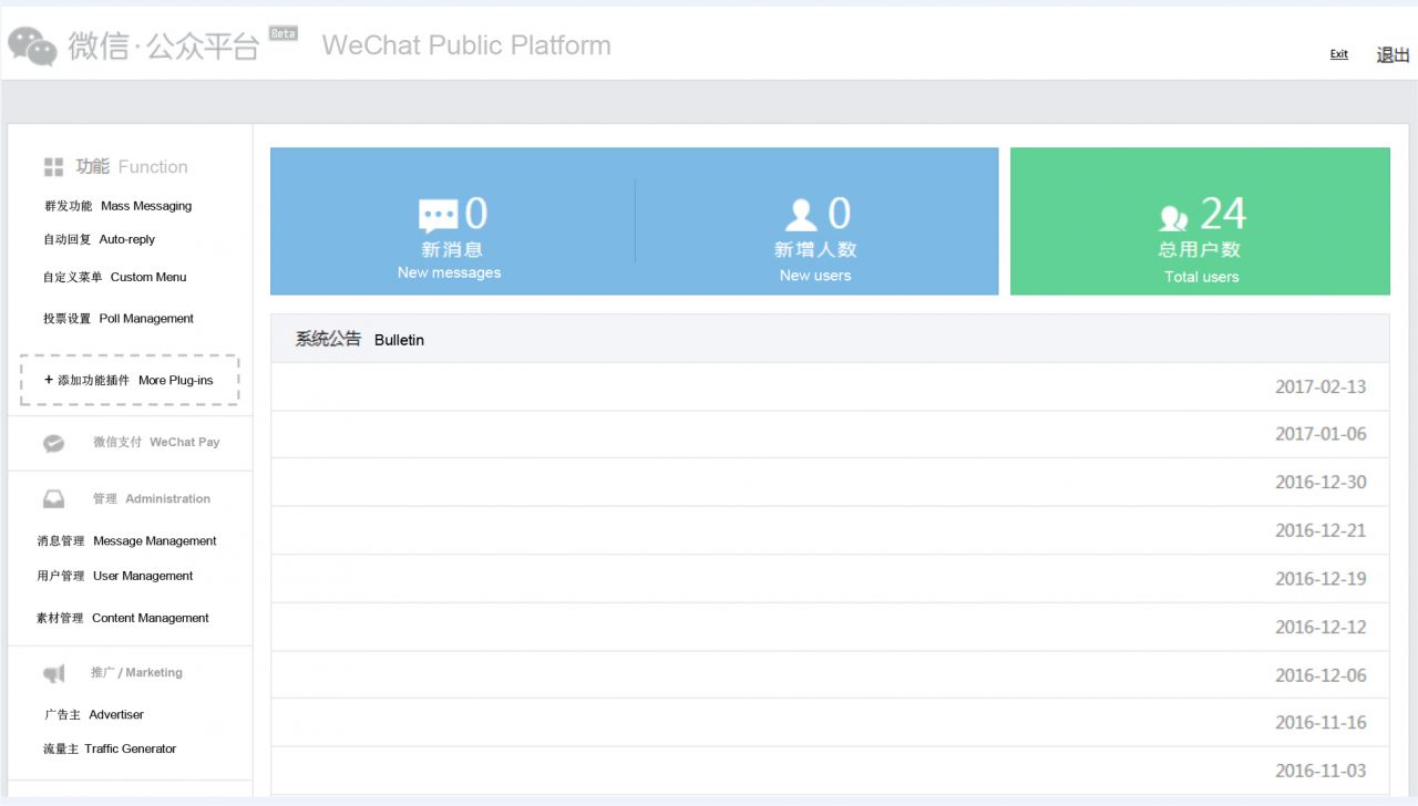 Firstly, check out the main page of the back office of a WeChat Service account below. A Service account will allow you to post 4 times a month.