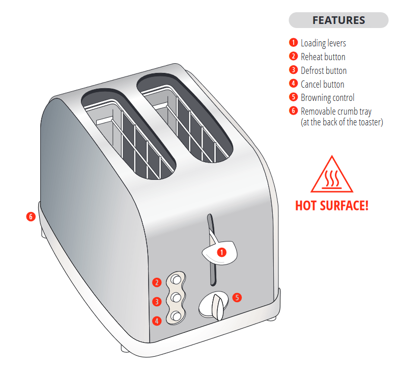 Product components, spare parts, and accessories description constitute an important part of the user instruction. Take a toaster, for example, the part description could be broken down to: