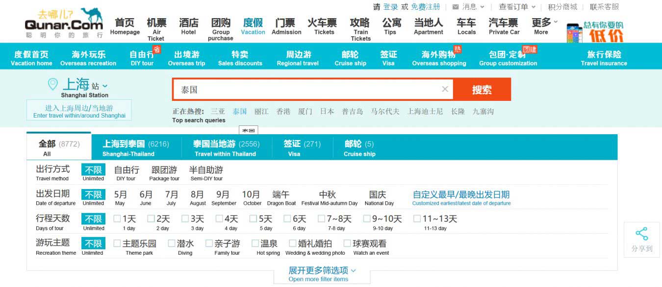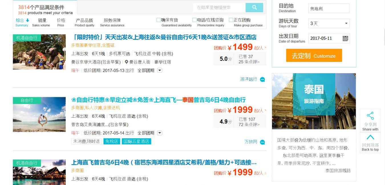 The filters are great: they let you specify the length of your trip and the activities you like, and they help you organize a DIY schedule or a group tour. They even give you an option to handle your visa situation! We are planning to go to Thailand, so let’s type into the search line (using Chinese characters). You will probably need to pick a DIY tour, so you can be in charge of all the details.