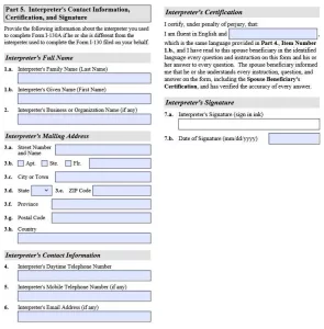 If you have used an interpreter to help your spouse understand and fill in Form I-130A, the interpreter’s contact information, certification, and signature must be included in Part 5 of the form (see below).