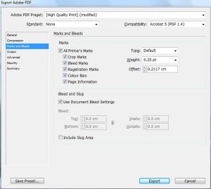 To export your file to a print-ready PDF, select File, then Export. When the export menu appears, select the Marks and Bleeds tab, and tick the All Printer’s marks boxes, as shown below. Also make sure that the Use Document Bleed Settings option is ticked. For best results, always make sure you are printing in the highest quality, as in the example below: