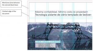 The most important item for the printer here is the bleed and bleed area, so that he knows exactly where the edges of the document will lie. A “bleed” is any object (such as an image, text, colour, etc) that extends past the edge of the area to be printed. No printing press can print exactly to the edge of a piece of paper, especially if hundreds or thousands of sheets are being printed. Therefore if you have inserted a bleed, your piece must be printed on a larger size of paper and then reduced to your finished size. It is important to communicate clearly with your printer provider to ensure this point has been fully understood on both sides. As you can see in the settings above, our bleed is 0.5 cm. You can see the bleed area of the document in the screenshot below: