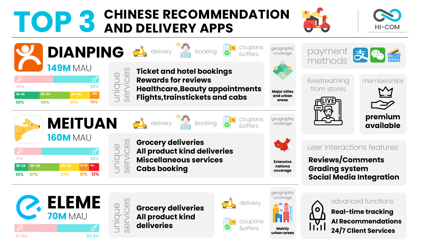 Its user base is 69% male and 31% female. Meituan offers a wide range of services beyond food delivery, including grocery deliveries, product deliveries, taxi booking, and access to various coupons and deals. It offers extensive nationwide coverage and supports multiple payment methods, such as WeChat Pay, Alipay and local bank cards.