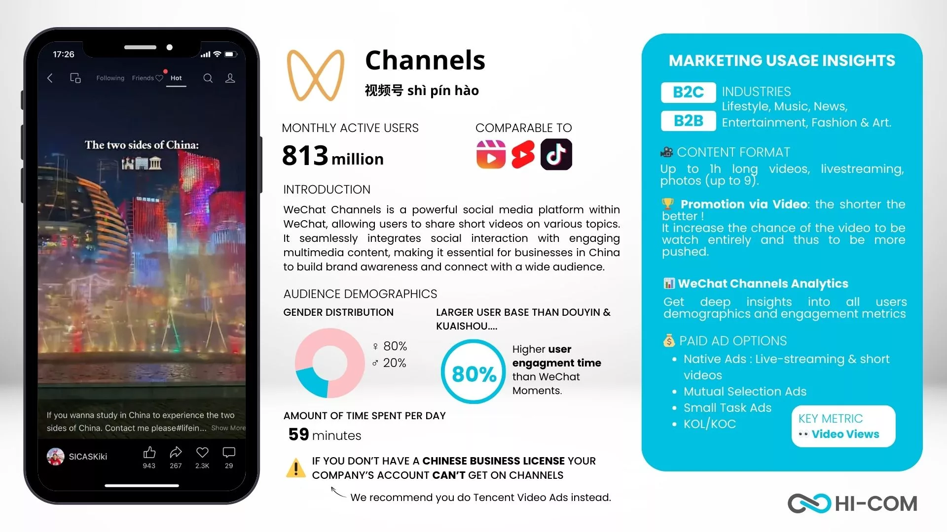 So Channels benefits from the enormous traffic from WeChat, making it a platform with a larger audience than Douyin and Kuaishou. This video format has the highest engagement time per user at 80% compared to photo sharing on WeChat Moments!