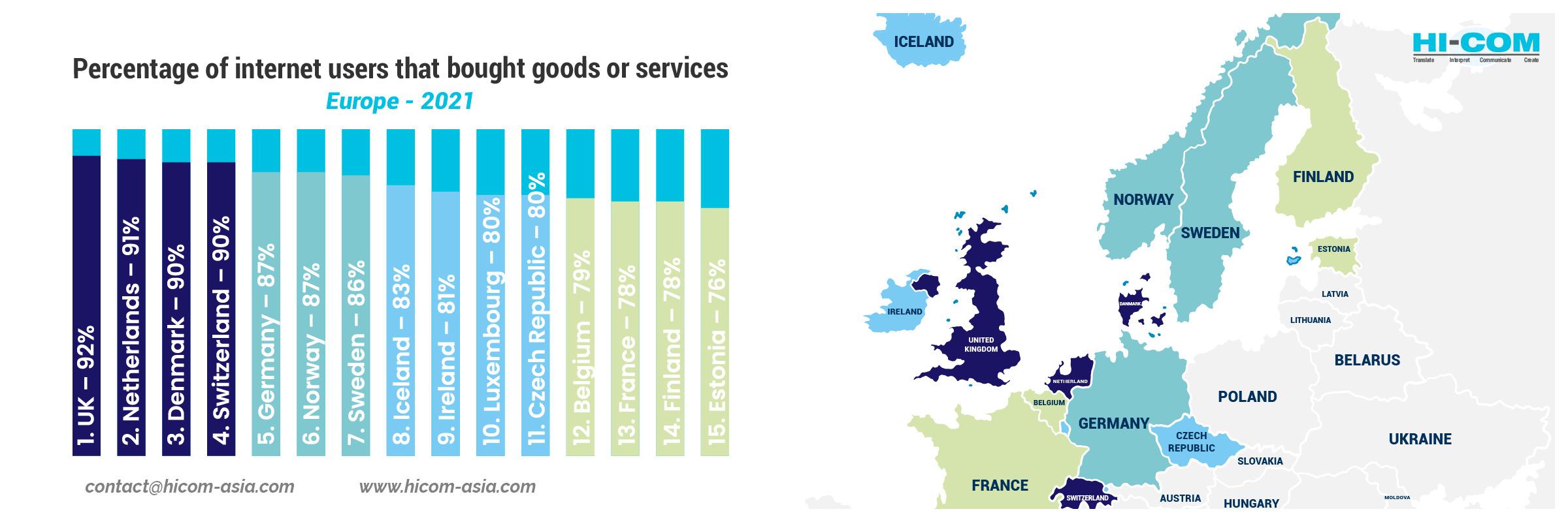 Percentage of internet users that bought goods or services online: 92%, the highest in the entire Europe region