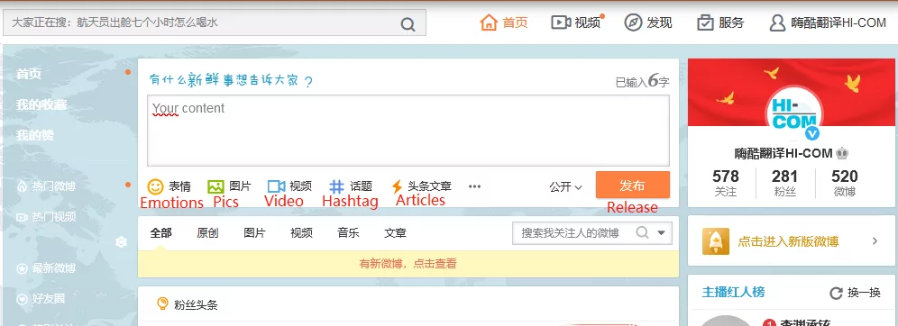 As a microblogging platform, Weibo’s posting functionality operates much like Twitter, with a few minor differences. There are a few different ways to get started posting: