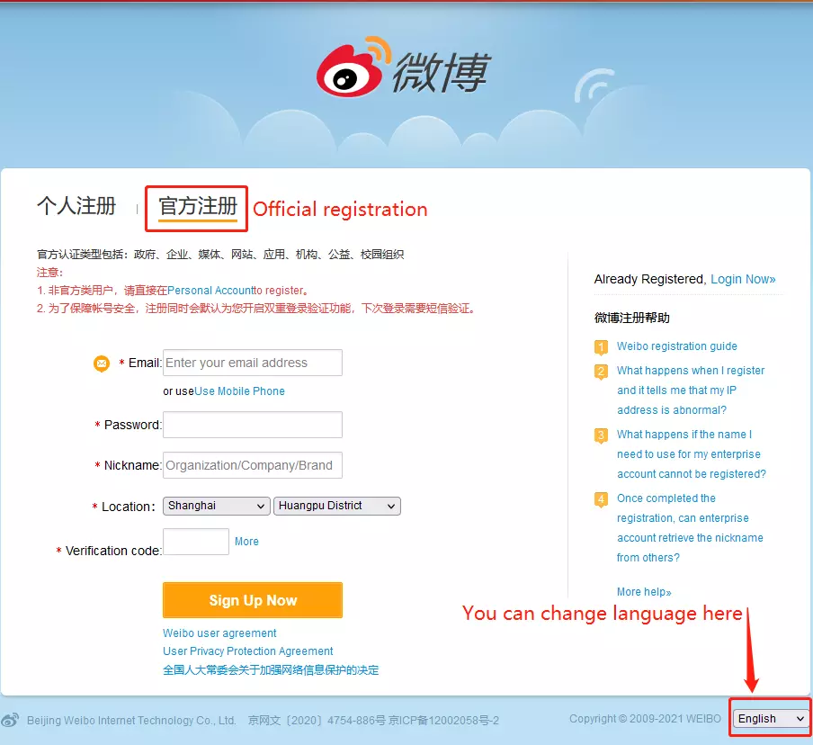 Go to the Weibo signup page and choose “Official Registration” to fill out the requested information.