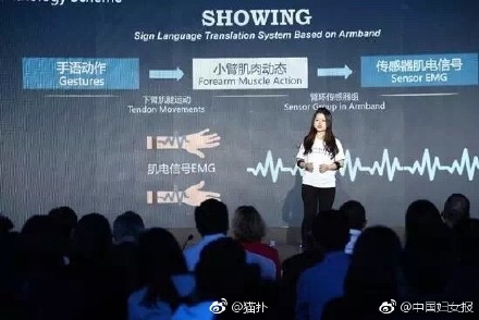 During a brief demonstration, the presenter reached out his hand with his thumb up. The characters meaning “hello” then immediately appeared on the display area of the APP they have called “SHOWING”. A black armlet around the arm of the presenter is used to catch the myoelectric signals of the hand movements, which look like a strap used in running.
