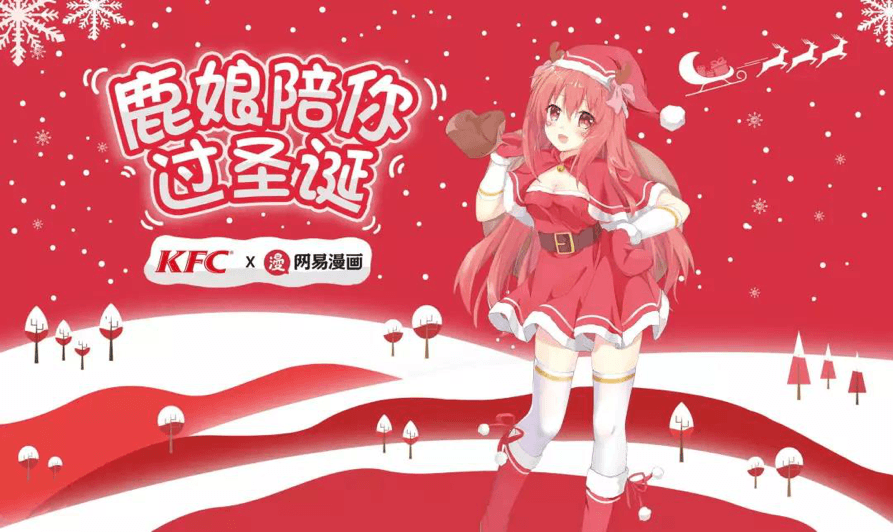 Christmas consumer groups in China tend to be younger, so marketing gimmicks that attract younger generations, like “alternative”, “quadratic element” and “Divine Comedy” have become the main marketing themes of major businesses. For example, KFC teamed up with NetEase Animation to launch the Christmas theme party with virtual idol IP Luniang as the core character.